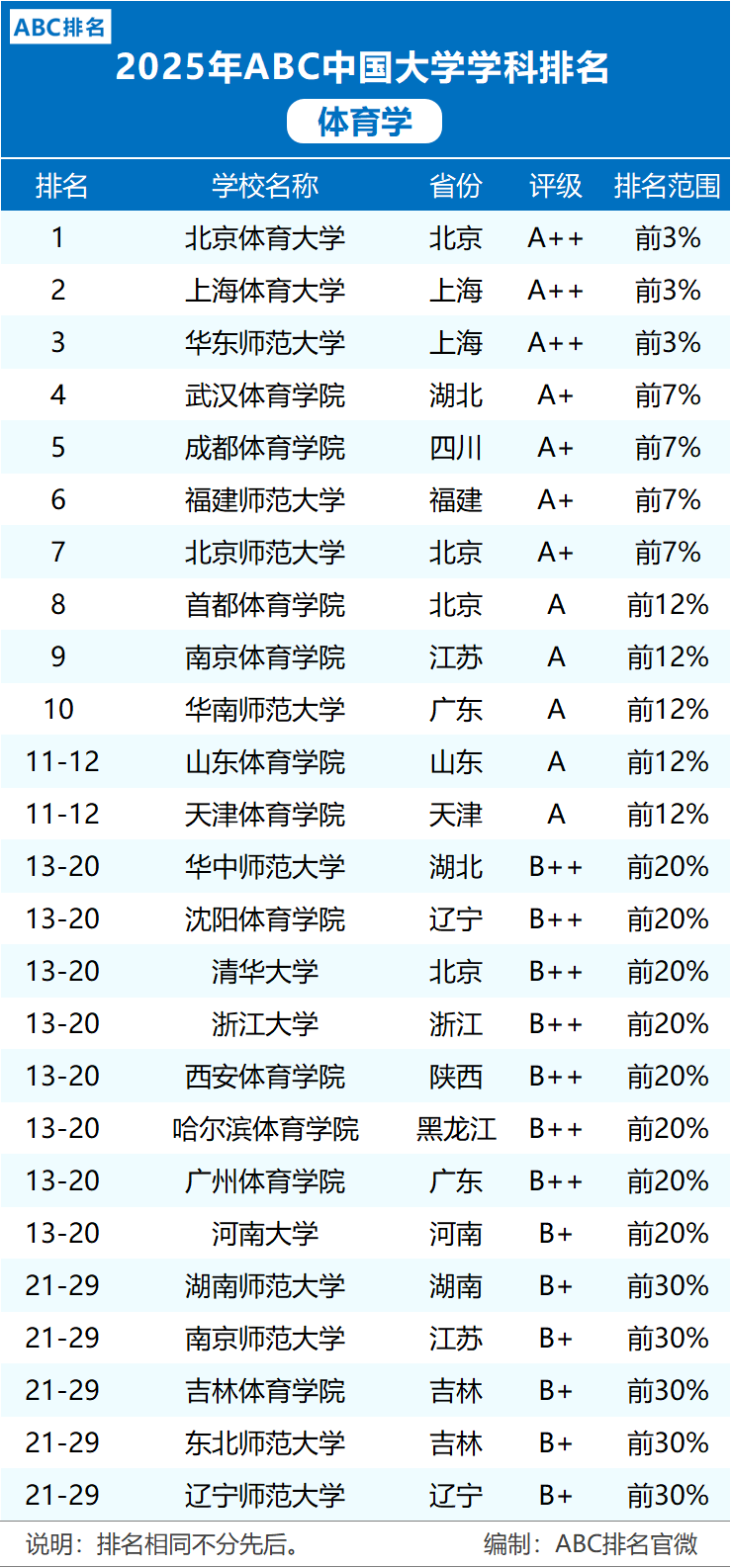 B++等级(前20%):华中师范大学、沈阳体育学院、清华大学、浙江大学、西安体育学院、哈尔滨体育学院以及广州体育学院。