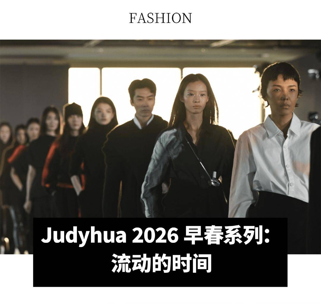Judyhua 2026 早春系列“流动的时间”于上海北外滩发布,以服装为媒介,将时间这一抽象概念具象化为可触可感的流动形态。本季打破时间作为线性刻度的传统认知,将其诠释为在身体与记忆间沉积、堆叠的立体空间。