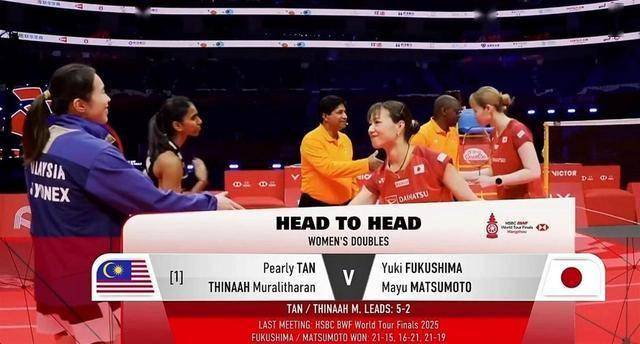 第二局比赛中,福岛由纪/松本麻佑在1比7落后的不利局面下,再次展现了她们的韧性。 她们一点点地将比分追上,并在11平后连得4分,以15比11拉开分差。 随后,在15比13领先时,她们打出了一波决定性的6比0的得分高潮,以21比13轻松获胜,从而以大比分2比0击败对手,率先晋级决赛。 这场胜利也让日本组合将对阵陈康乐/蒂娜的历史交手记录改写为3胜5负,虽然仍处下风,但已在最关键的时刻赢得了最宝贵的一胜。