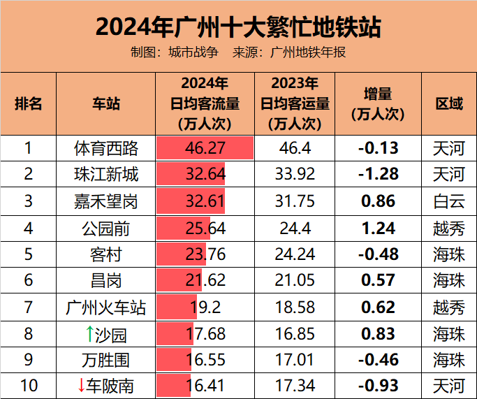 2024年,广州日均客流量最高的10个地铁站依次为:体育西路、珠江新城、嘉禾望岗、公园前、客村、昌岗、广州火车站、沙园、万胜围、车陂南。其中,沙园地铁站从第10名升至第8名。