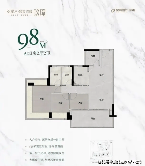 98㎡3+1 房:主朝向朝南,主卧配备 270° 无柱飘窗,视野开阔,次卧和阳台尺度大幅增加,满足日常休闲与晾晒需求,适合刚需家庭;
