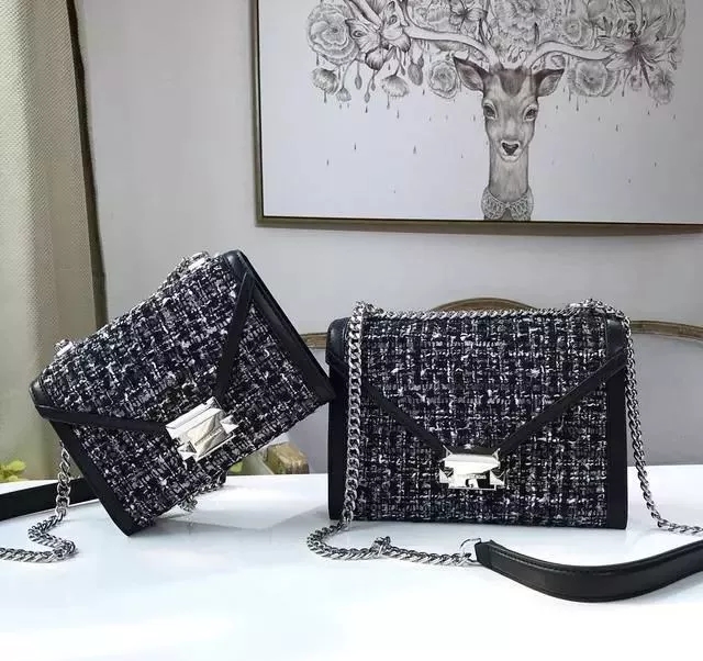 2,MK呢布款方包,大小2个型号。正面和背面是软呢,其他拼接的皮面为牛皮。非常优雅大方的一款,相比爱的幂方的个性铆钉,呢布款更甜美温柔些。
